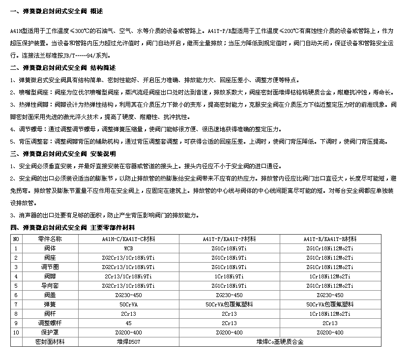 产品详情:产品详尽信息:A41Y-160,320型适用于工作温度≤200℃空气的装置和管道,氮氢混合气体,水和其他介质。A41Y-160P/320P,A41Y-160R/320R型适用于腐蚀性气体的装置和管道或工作温度≤200℃的液体介质,作为过压保护装置。